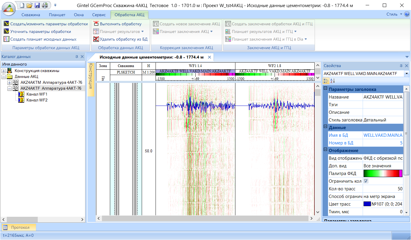 Обработка данных СГДТ, регистрируемых аппаратурой СГДТ-НВ или различными одно-и многоканальными цементомерами, выполняется совместно с другими методами каротажа (ГГКп,НК,ГК, КВ).
